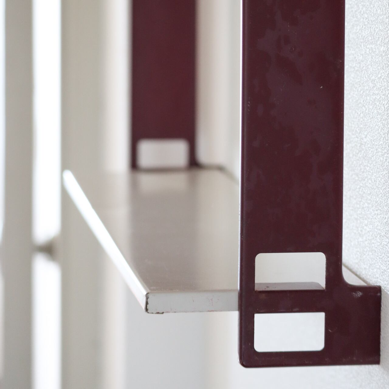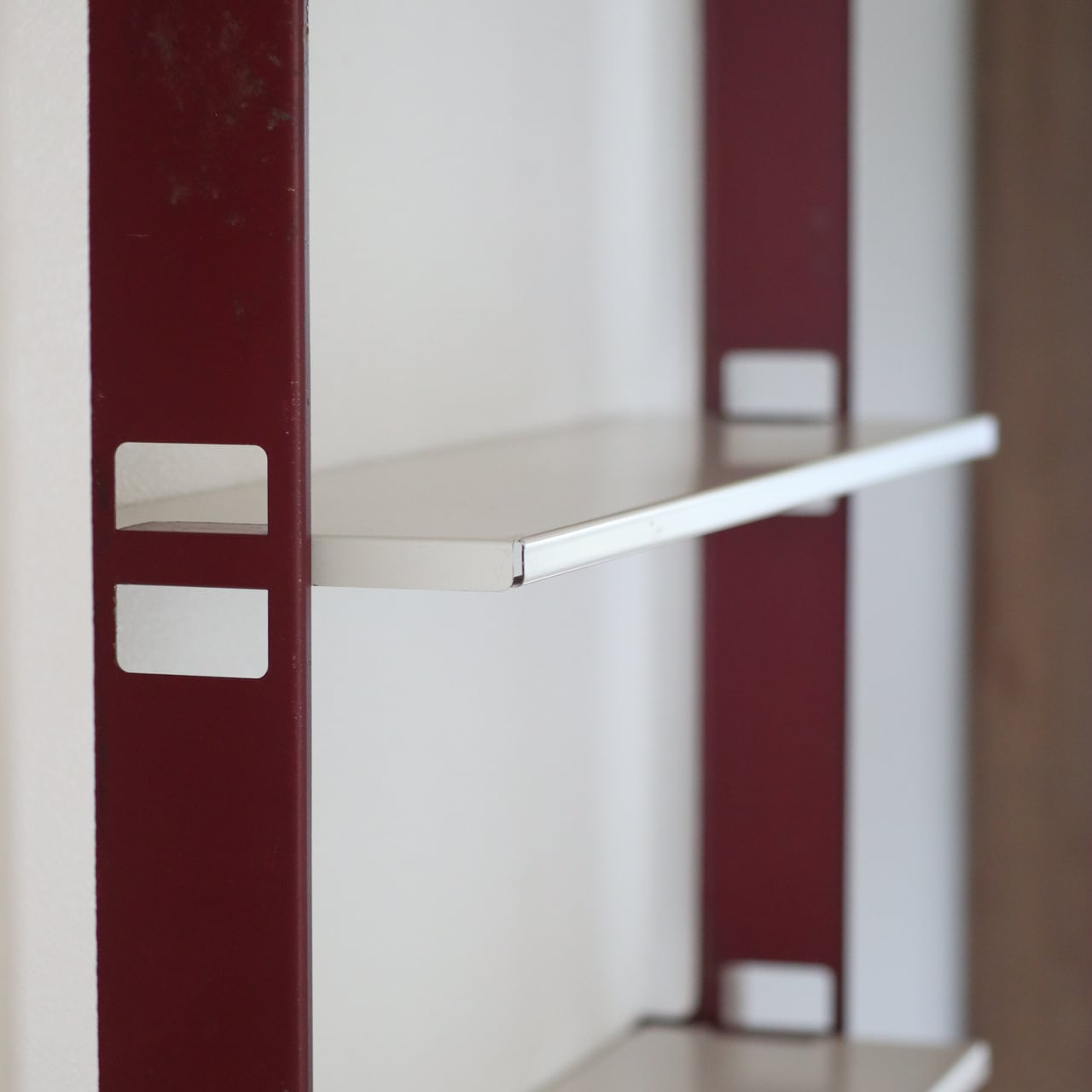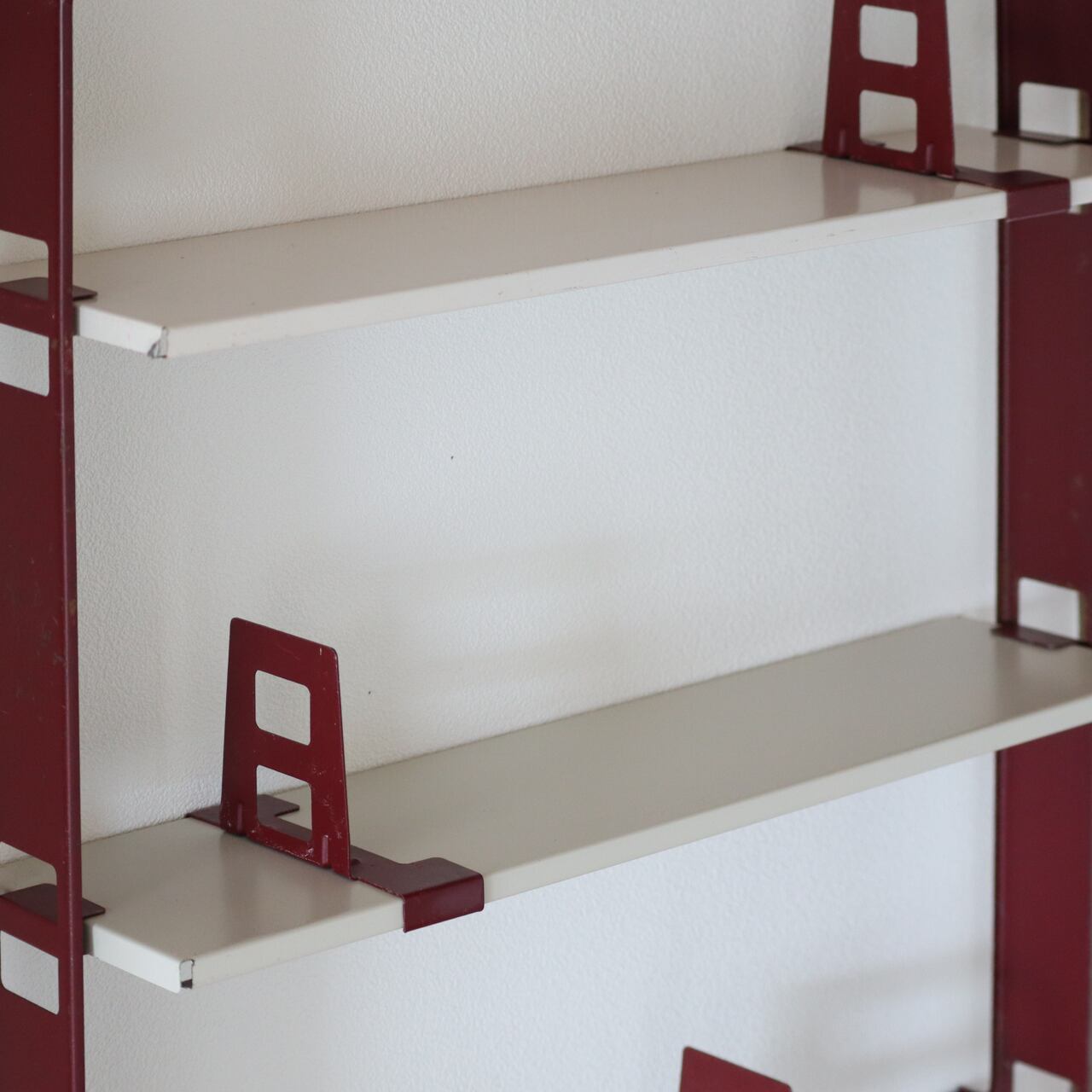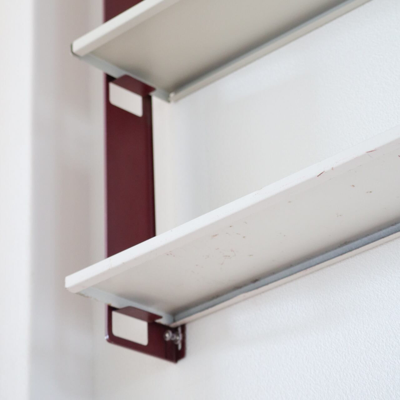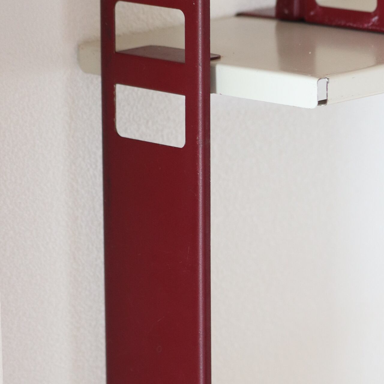 本来サイドフレームが黒色のものを、ブックスタンドと同色のバーガンディにリペイントされており、本来の無骨なイメージを和らげ、上品で落ち着いたスチールワークに昇華しています。