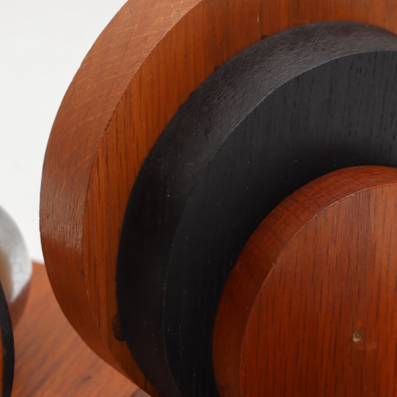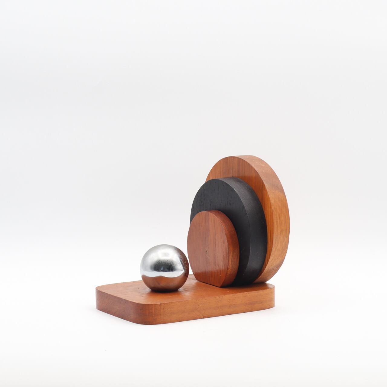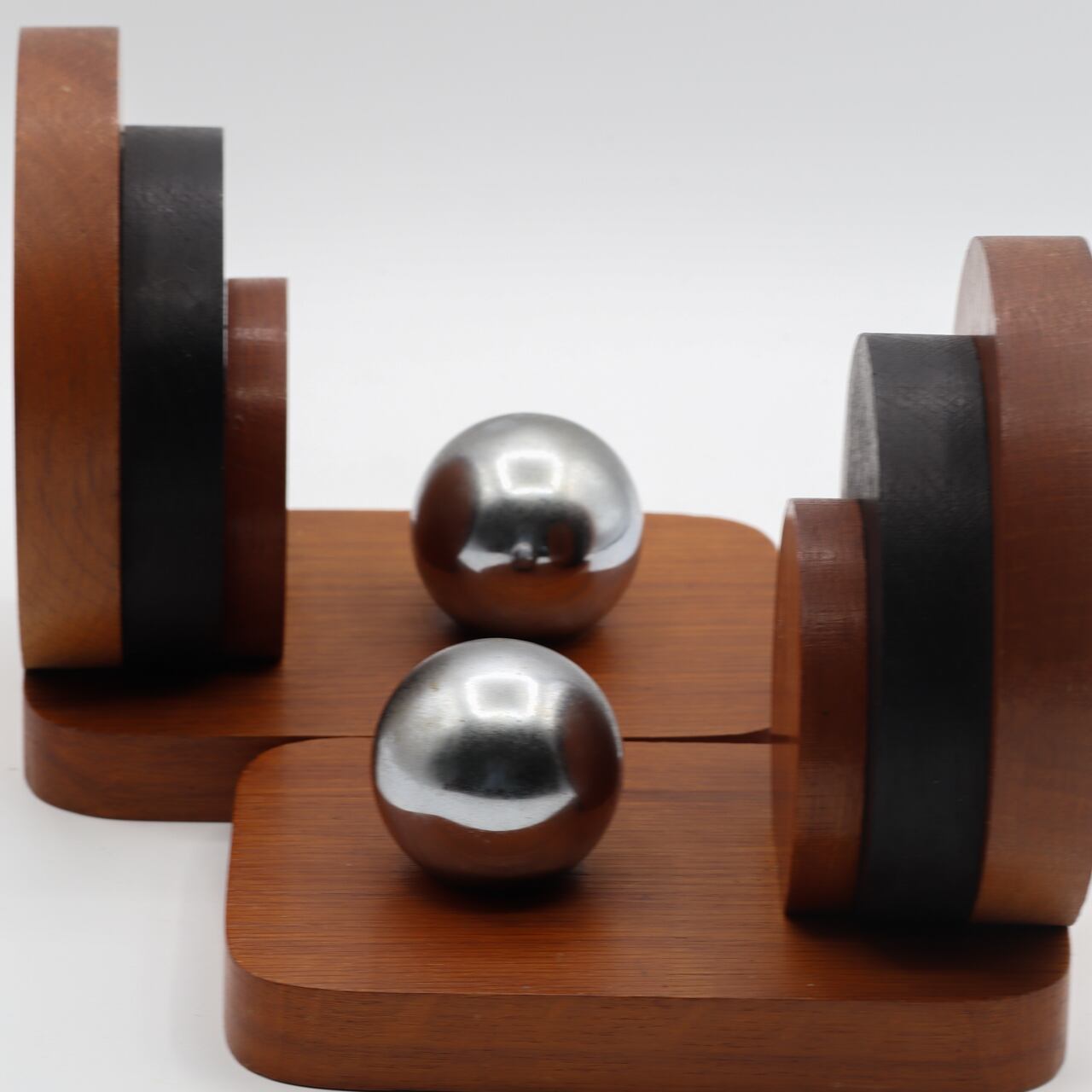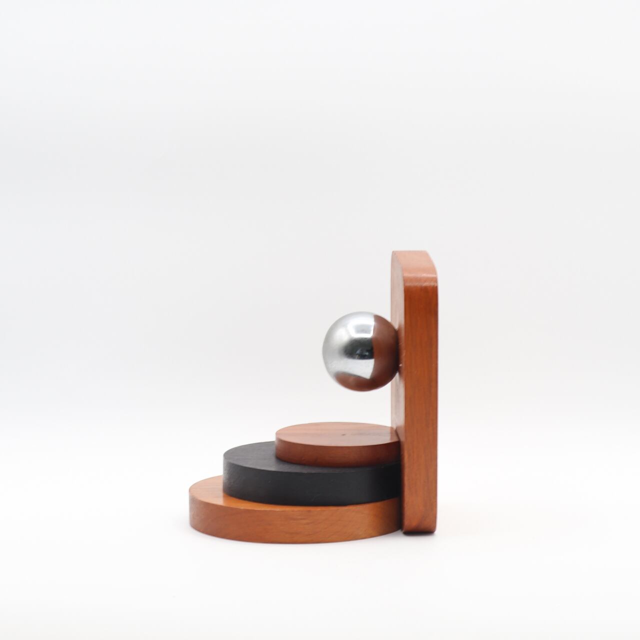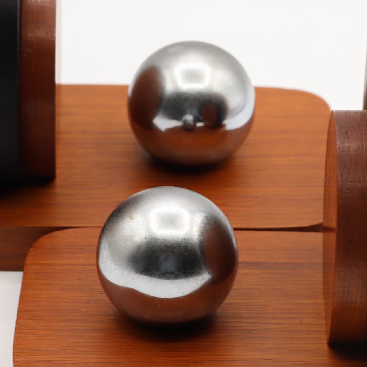 木製のボディに浮かぶ鏡面仕上げのステンレスの球体は、