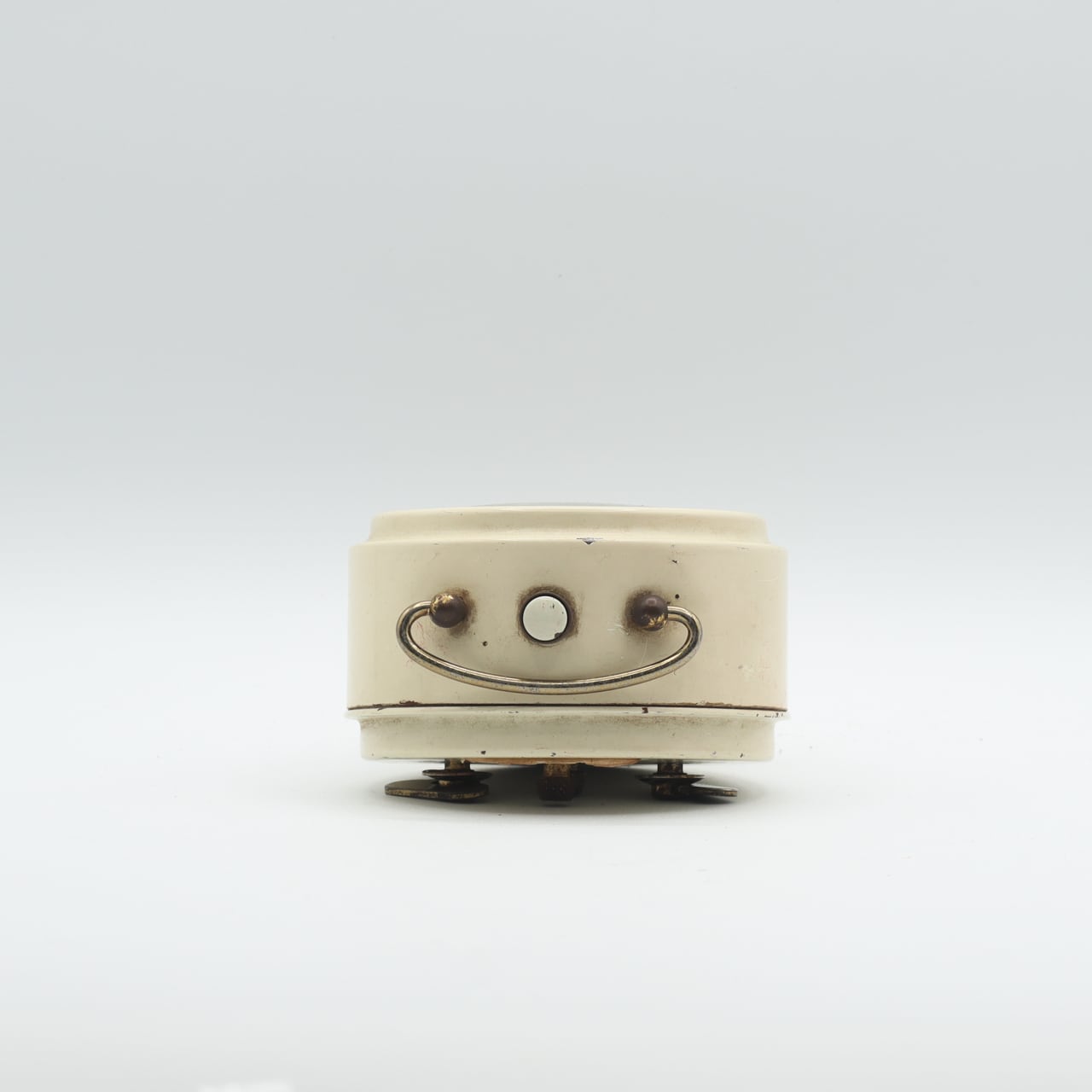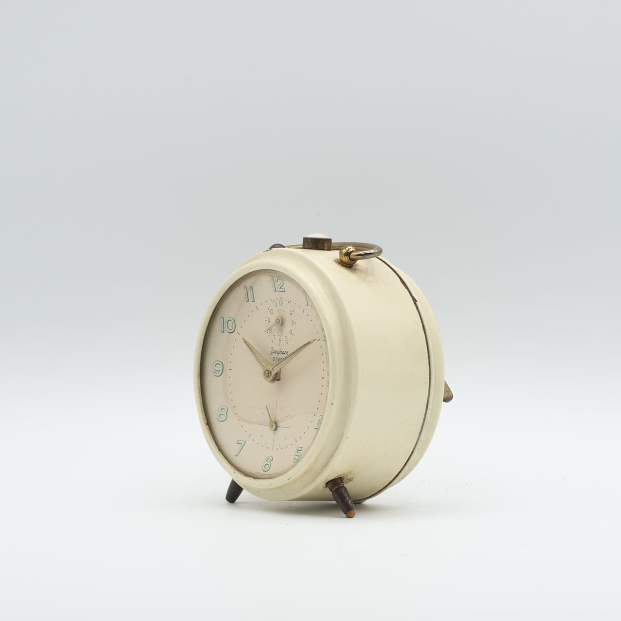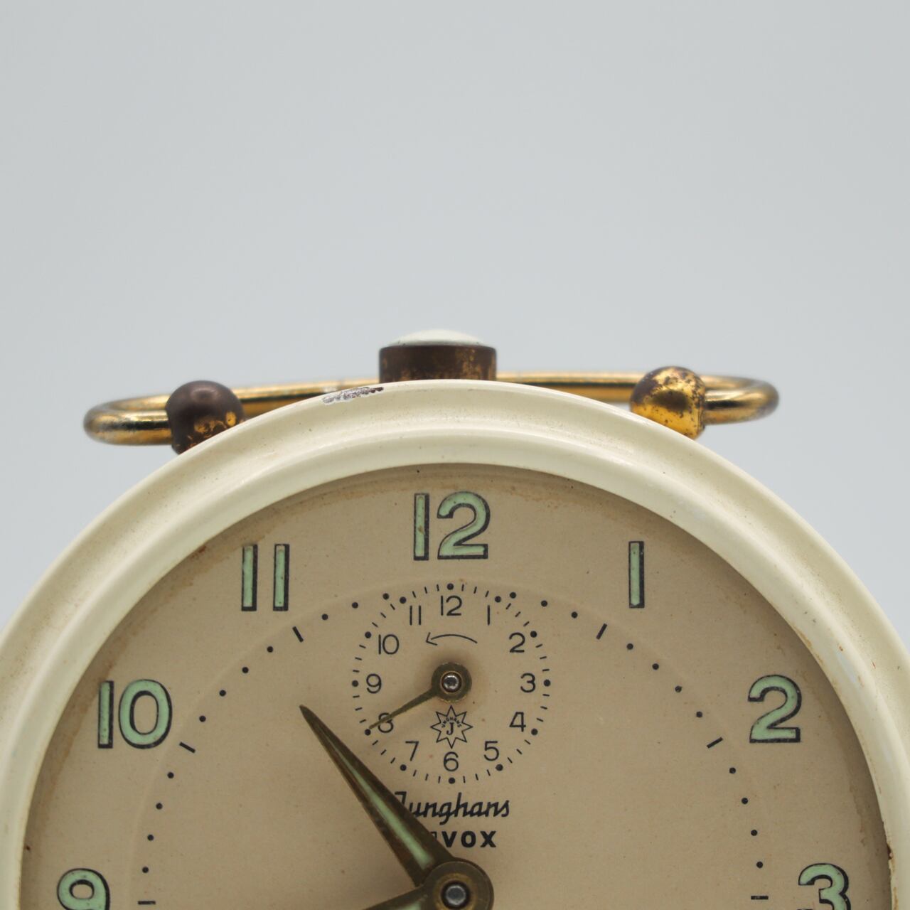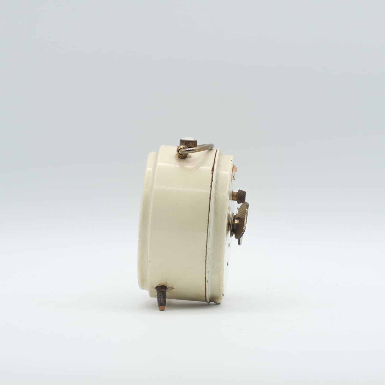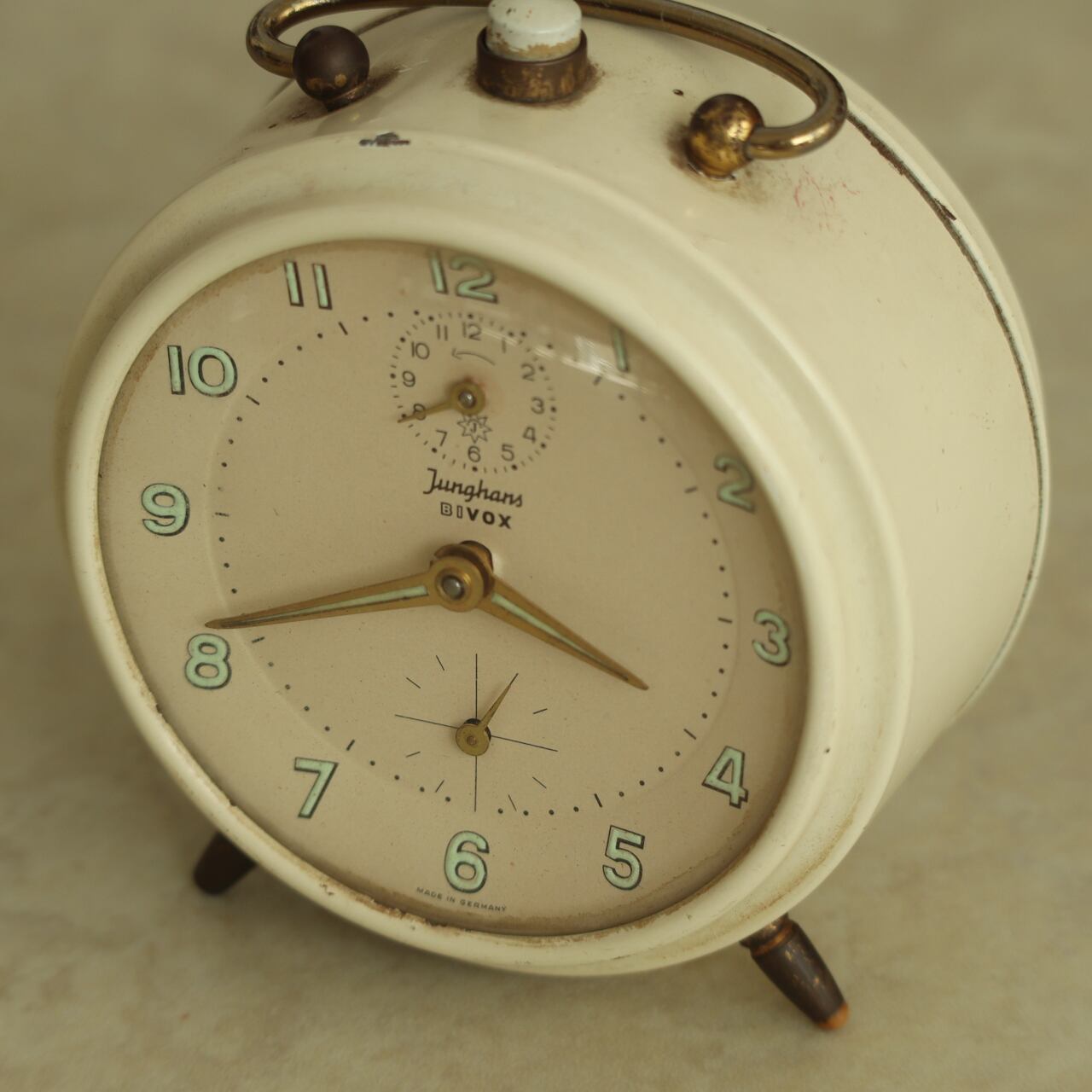 クリーム色のボディと真鍮のパーツ、シンプルで小さなアラビア数字のインデックスが程よい装飾です。