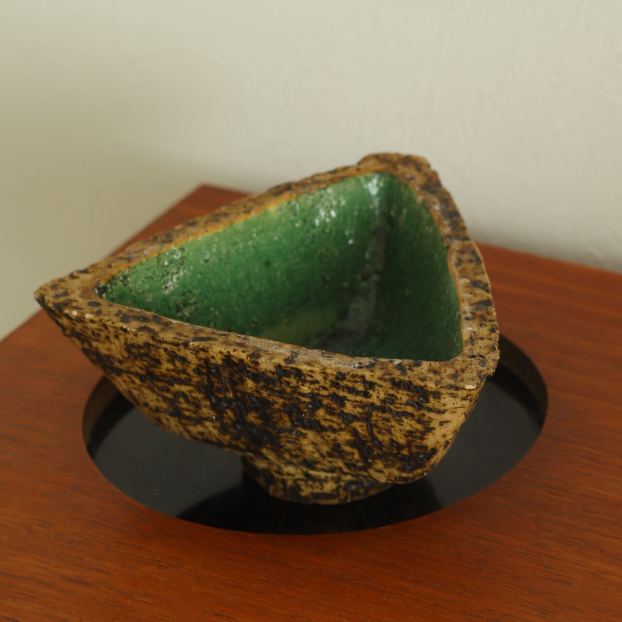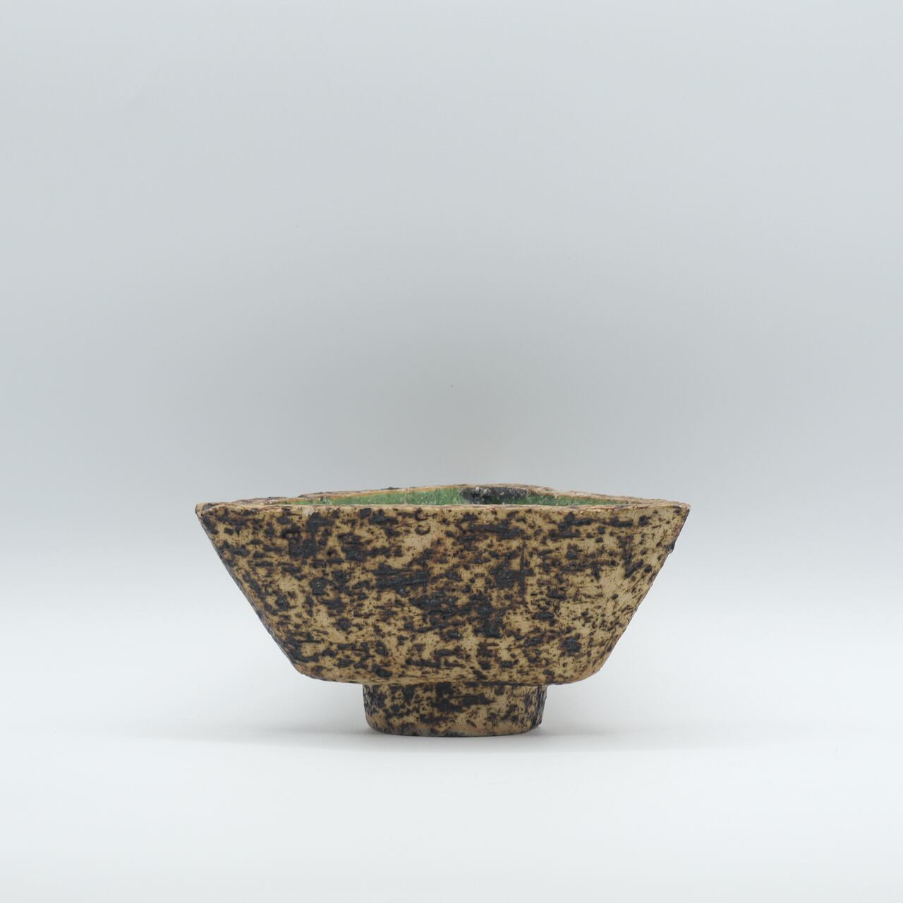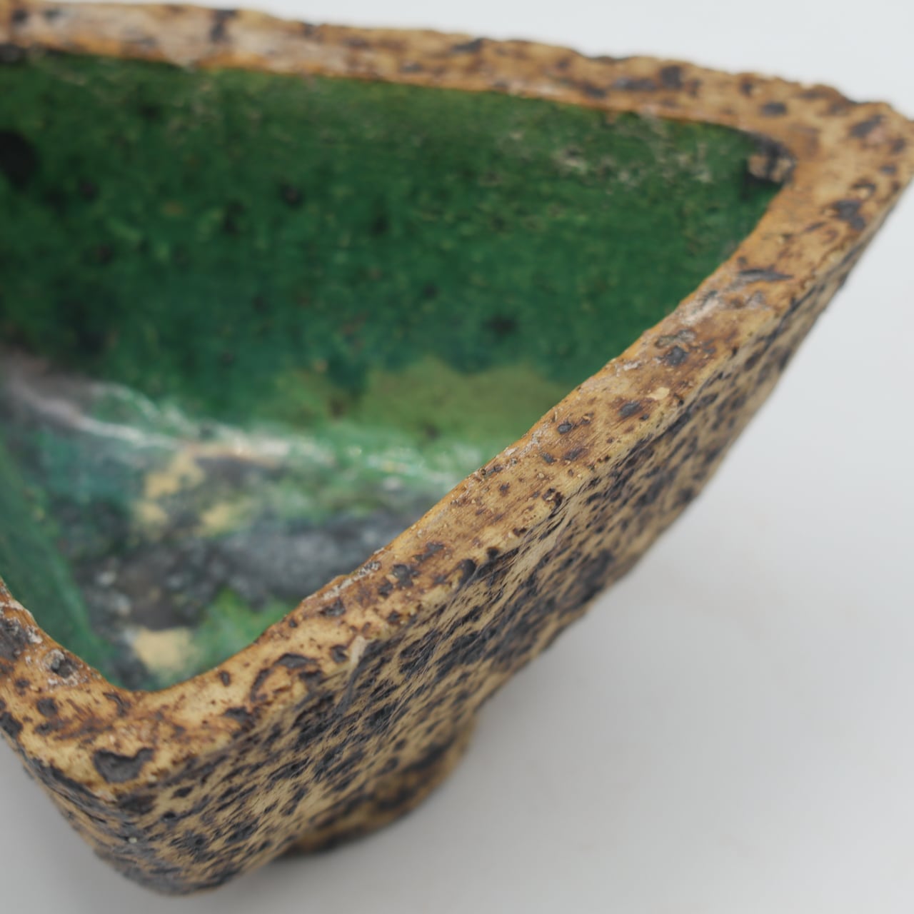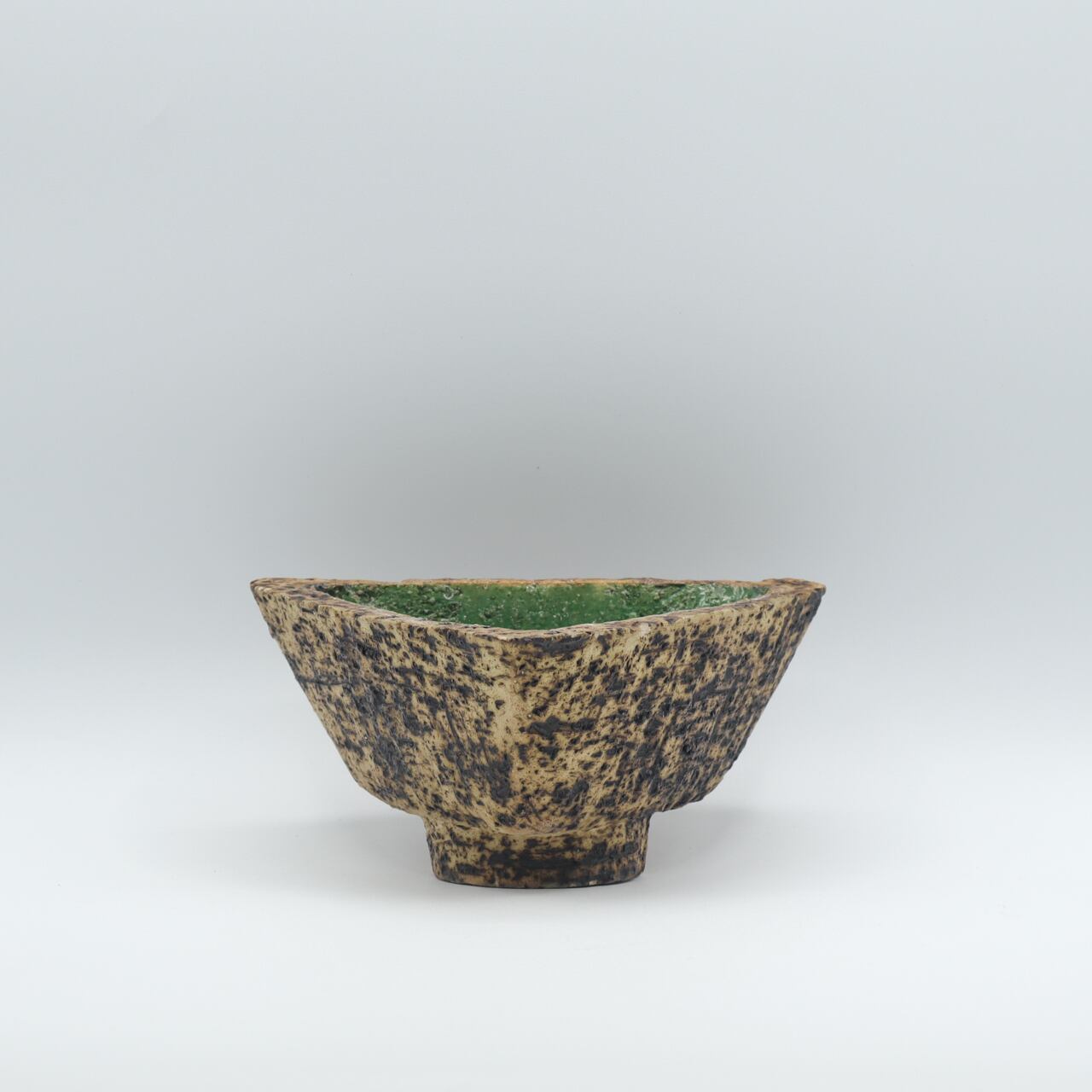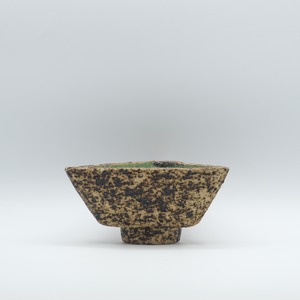 ファットラバのような凹凸と焼けたような質感の外面に、深緑の釉薬が施された内面の対比が、火山のカルデラを彷彿とさせる美しい作品です。