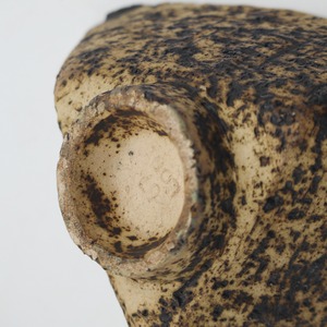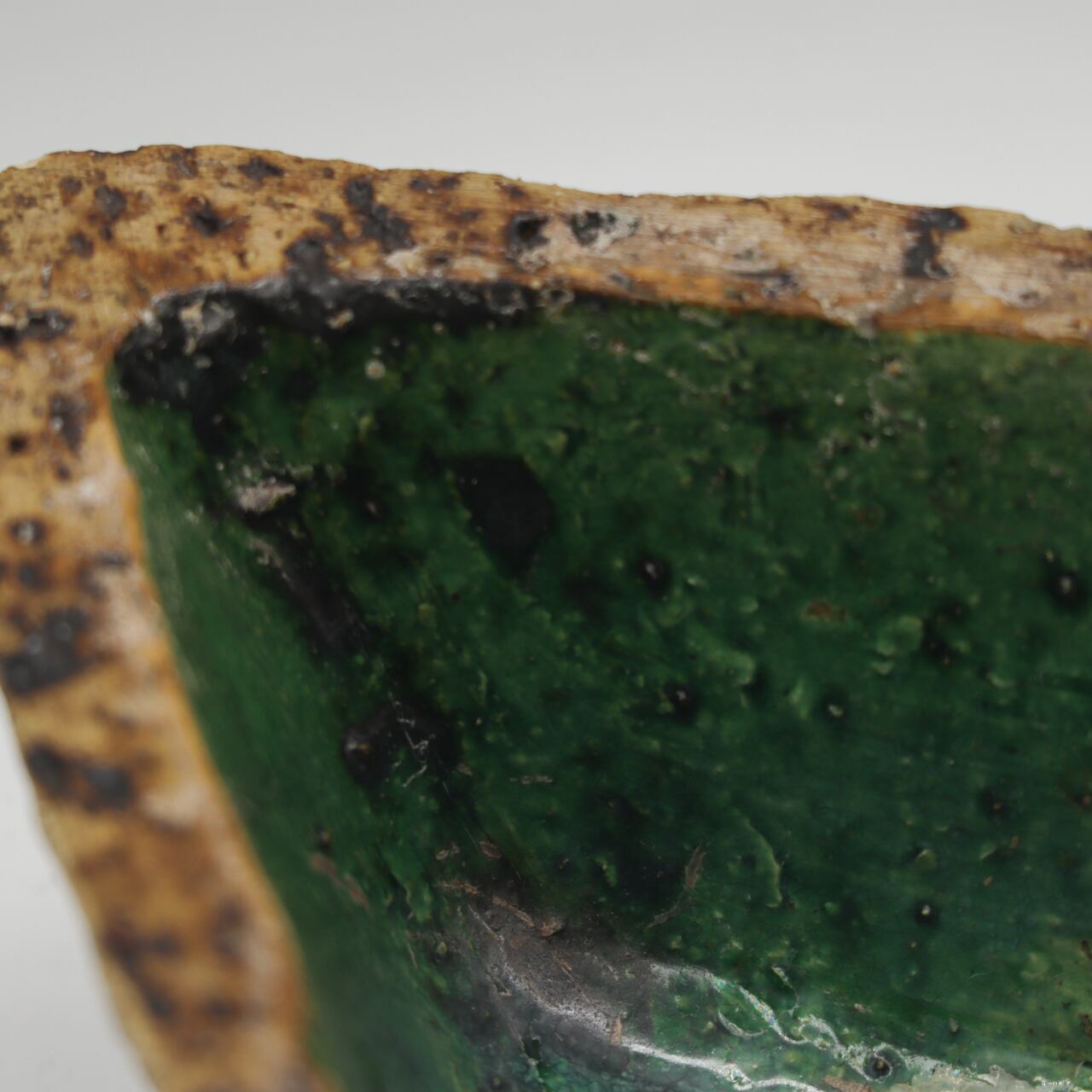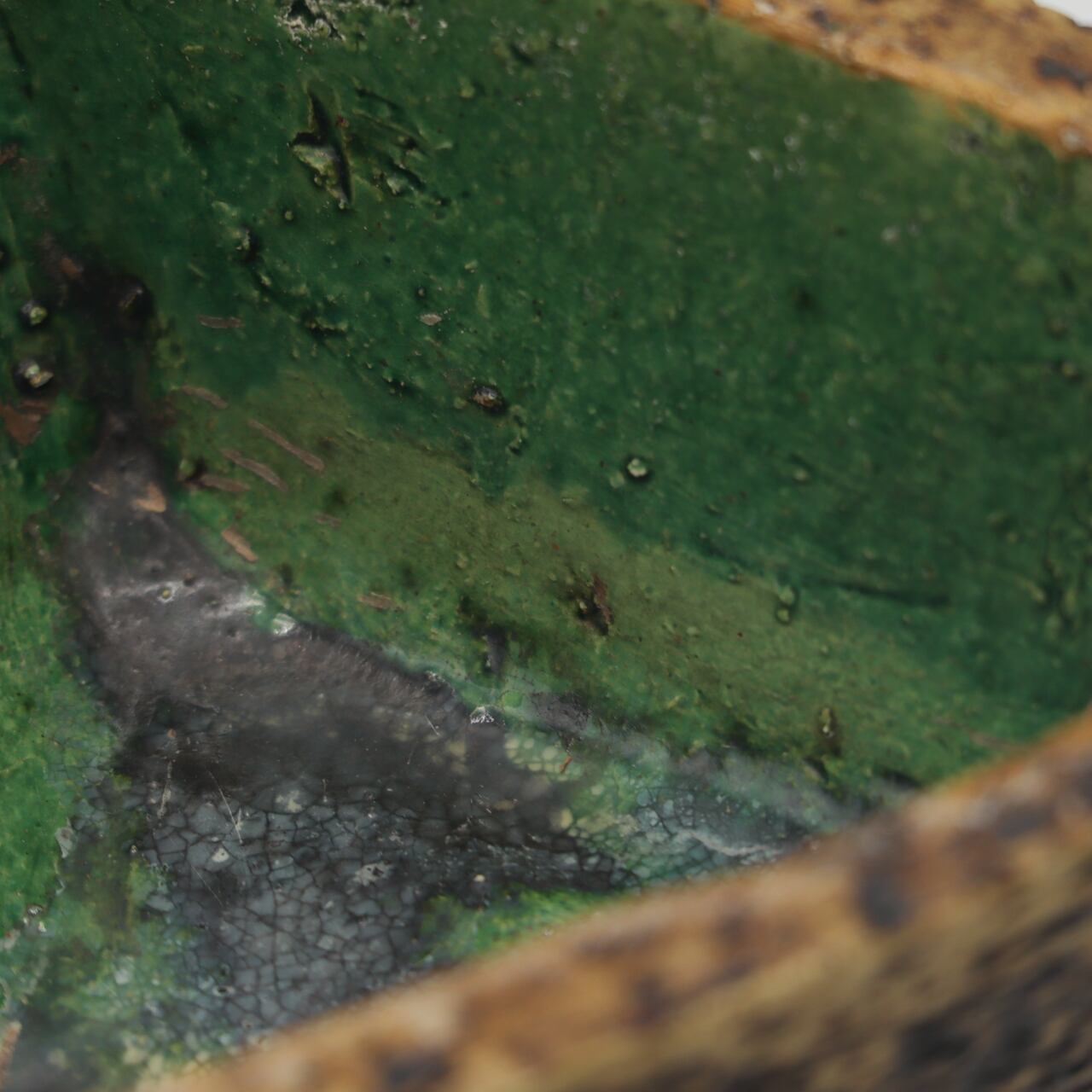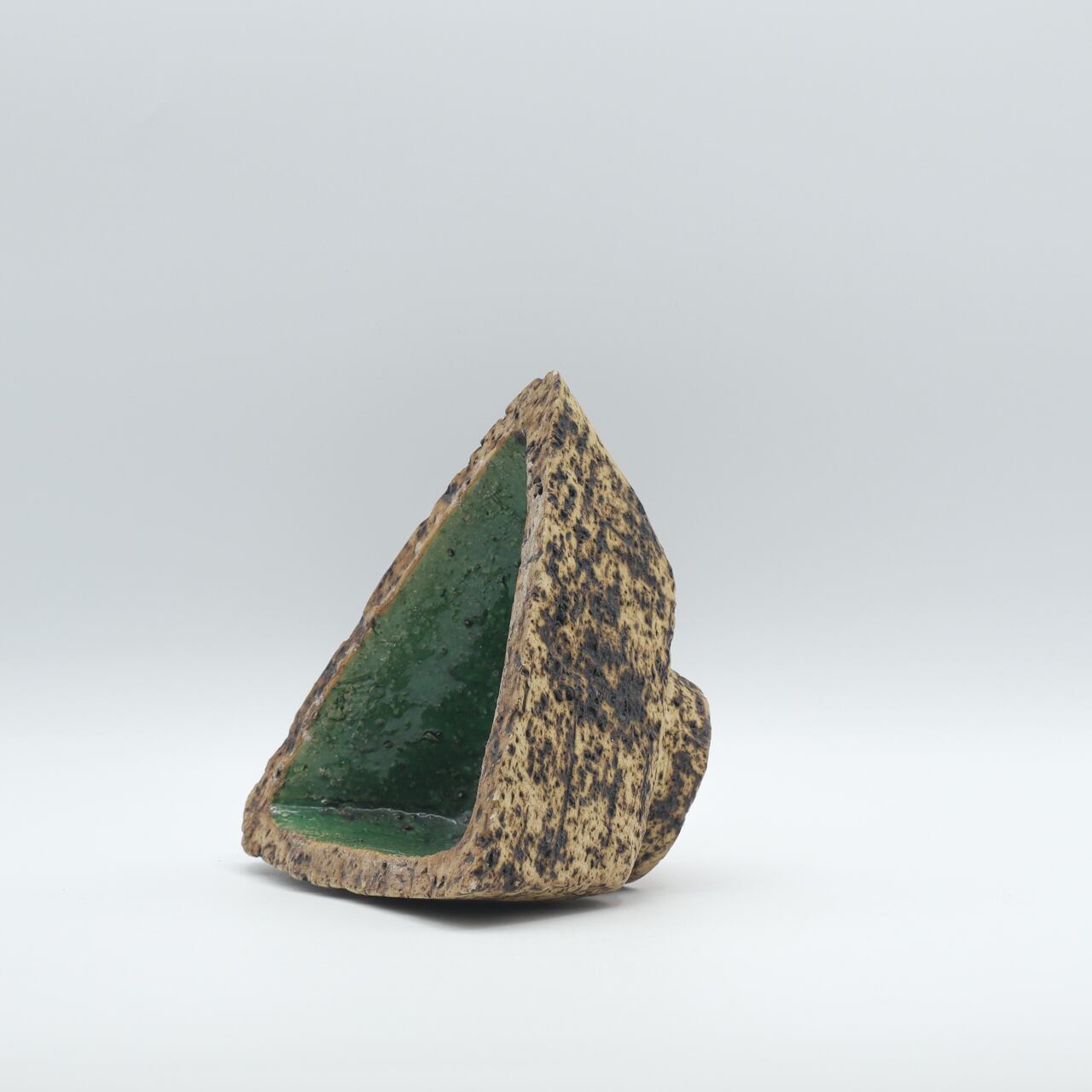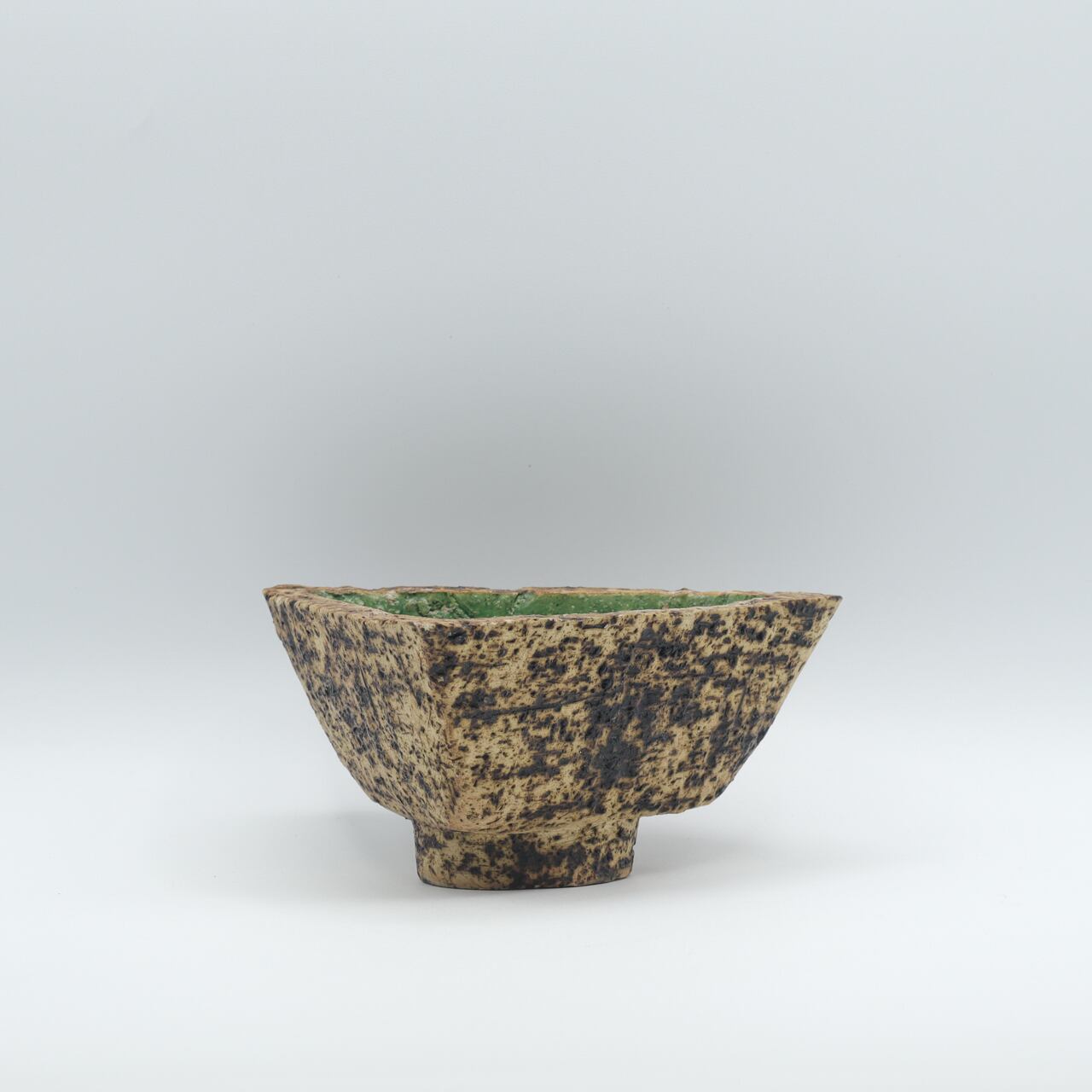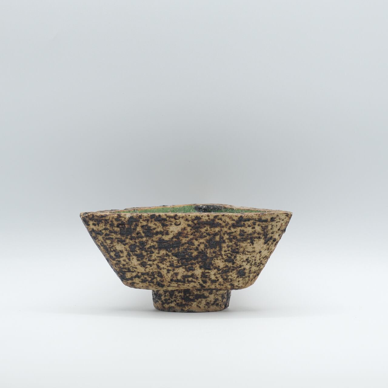 ファットラバのような凹凸と焼けたような質感の外面に、深緑の釉薬が施された内面の対比が、火山のカルデラを彷彿とさせる美しい作品です。