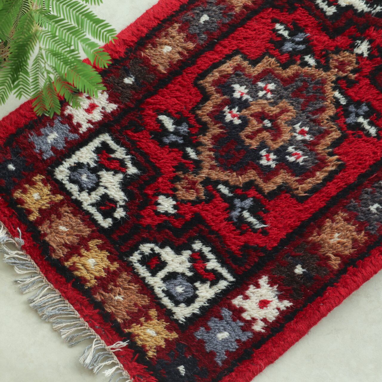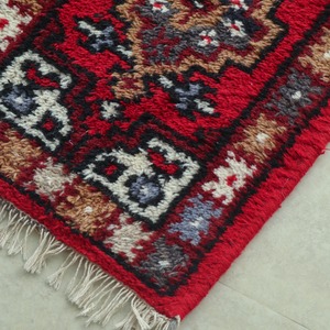 赤をベースに、ベージュ・ブルー・グレー・ネイビー・テラコッタが均一に配置されており、モチーフは全体的に大振りで可愛らしい印象です。少しチロリアンな雰囲気も感じさせます。