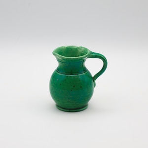 このブランドでは象徴的な、グリーンの釉薬を使った作品群の1つで、クラシカルなフォルムを引き締める鮮やかなボディに、細かな鉄点の浮きが鈍い輝きを放っています。現代のインテリアにも合わせやすいモダンな