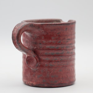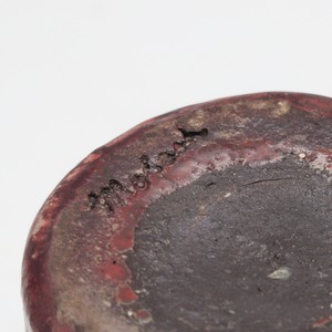 深みのある赤褐色の素地に、青みのある乳白色の釉薬が所々施されており、金属のようなテクスチャーに見える質感が面白い作品です。内側は白色の釉薬が用いられています。