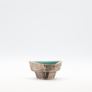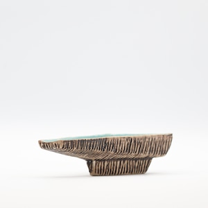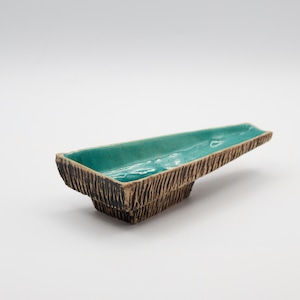 外面の樹皮のようにも見える櫛目模様に、ブルーグリーンの内面の瑞々しい釉調のコントラストが、水辺の風景を切り取った意匠に思わせます。