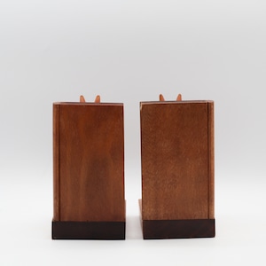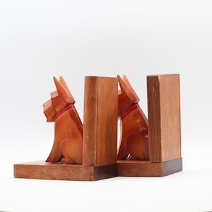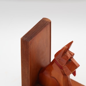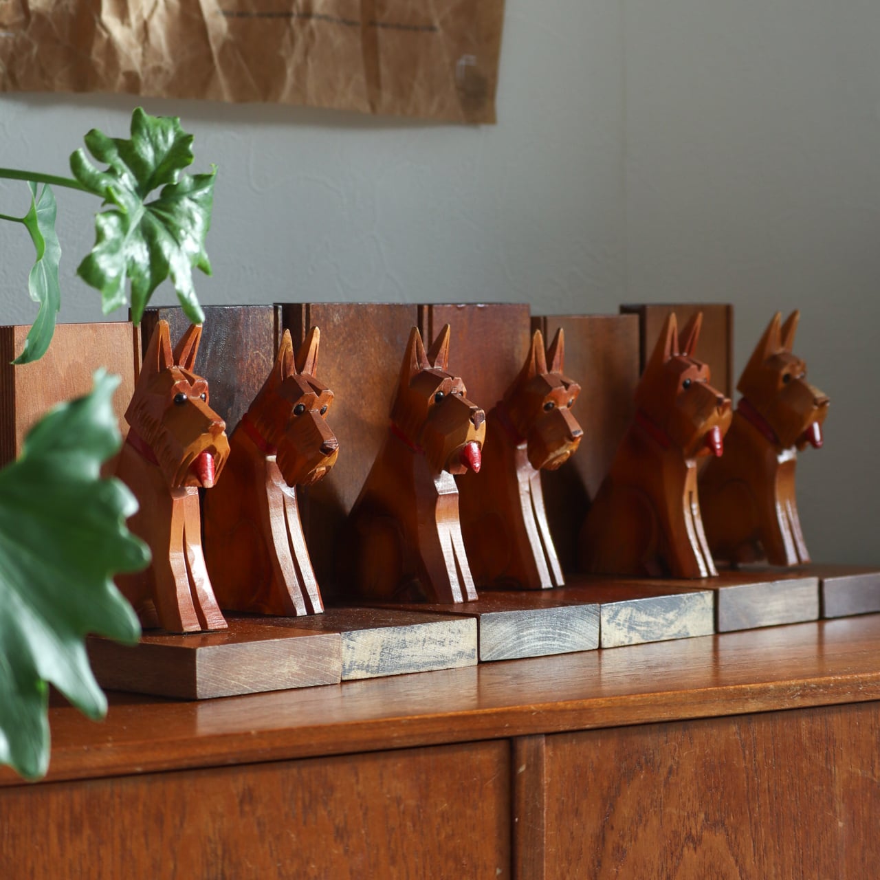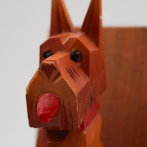 「本を守る番犬」という洒落も見えるスコティッシュ・テリアのオブジェが象徴的で、背板は本の形にあしらわれています。デフォルメ感ある直線的な彫りで、アイコニックで可愛らしいな印象です。