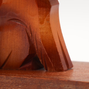 「本を守る番犬」という洒落も見えるスコティッシュ・テリアのオブジェが象徴的で、背板は本の形にあしらわれています。デフォルメ感ある直線的な彫りで、アイコニックで可愛らしい佇まい。