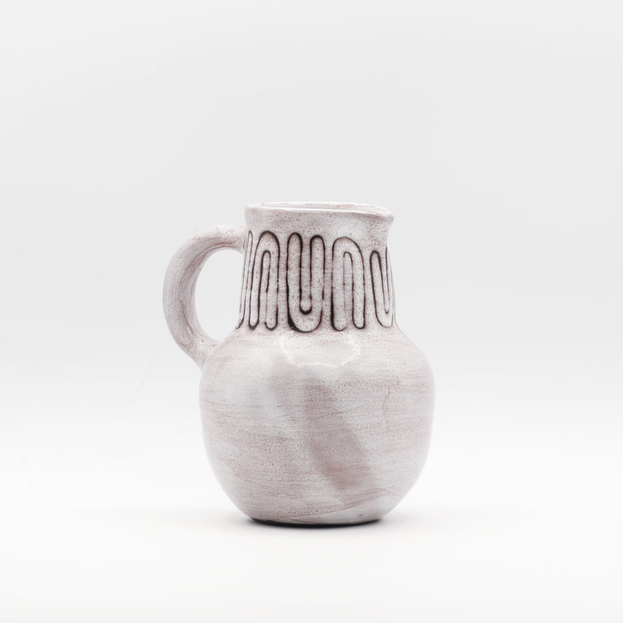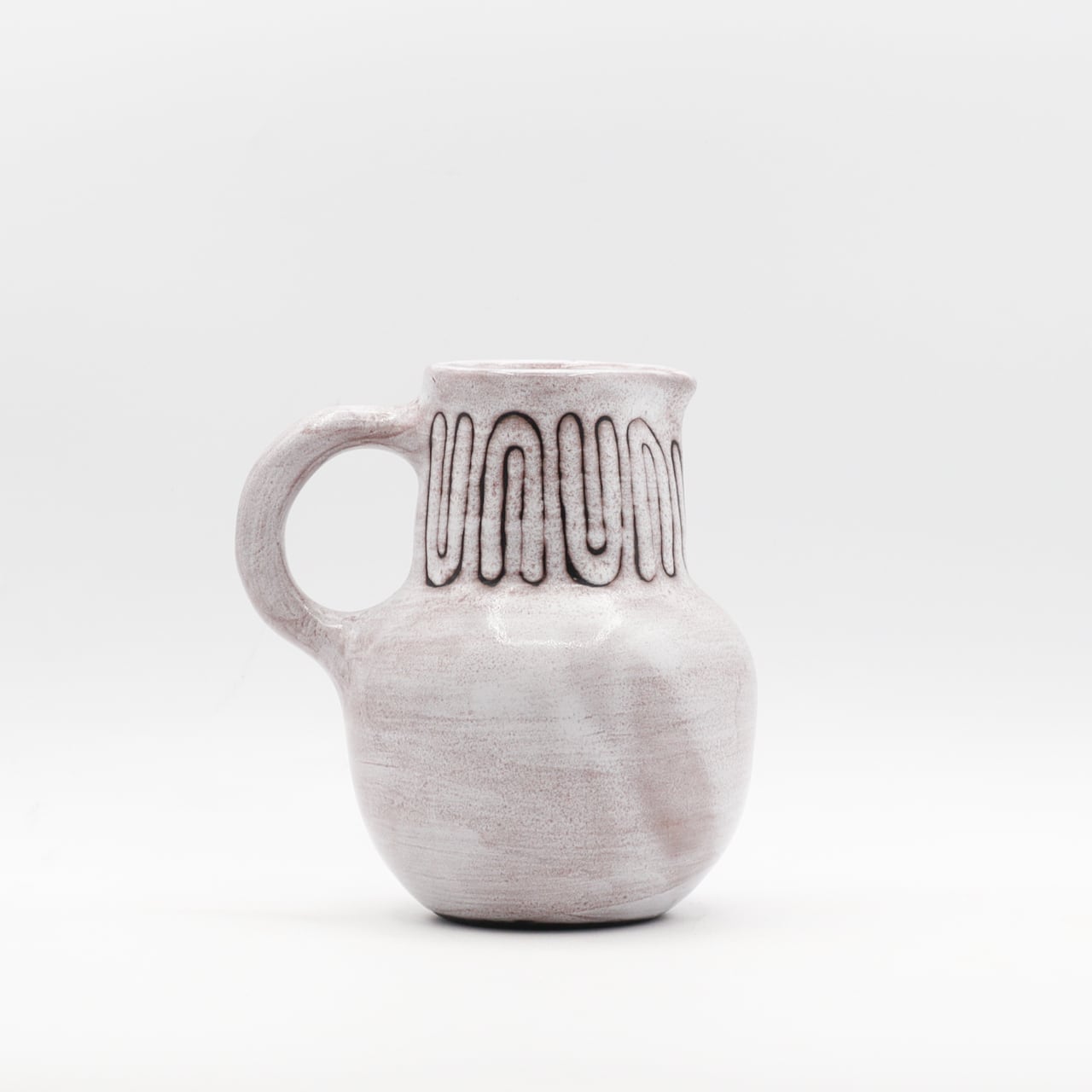 丸みのあるボディにやや太めで無骨なハンドルが、ミッドセンチュリー期のモダンクラフトに影響を受けていることがうかがえる作品です。