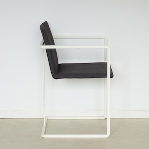 一見、カンチレバーのようにも見えるフレームは、 背面に垂直軸の細いフレームが一本通っており、この構造のアレンジによって、フォルムの安定感と意匠の複雑性をもたらしています。